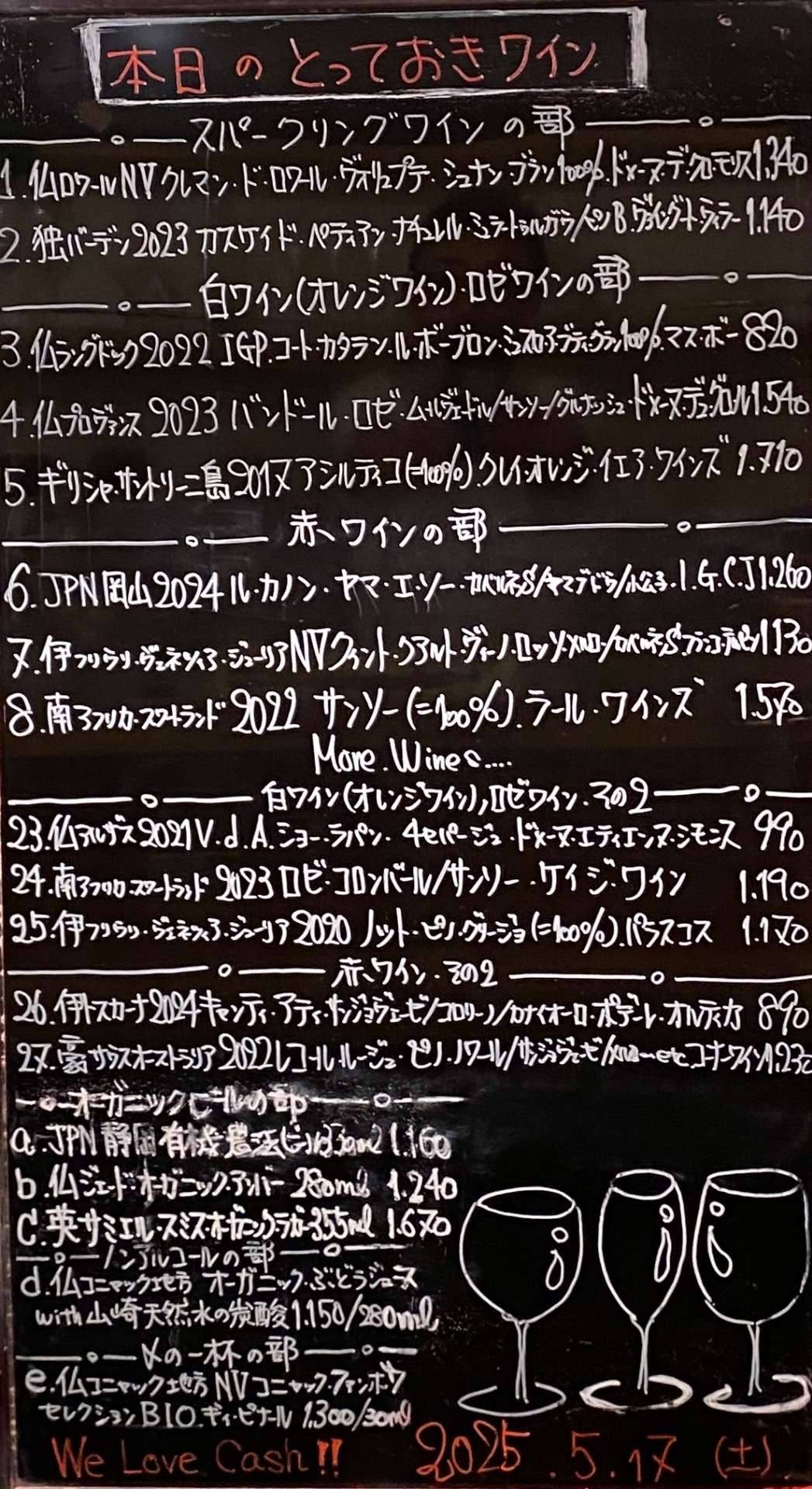 2025年5月17日 2025/05/17 皆さま、こんばんはーーッ! 今日もお席、空いております。 御予約、お待ちしておりまーす☆ ッーーーーーー事で今宵も千住葡萄酒 準備万端、整いましたョ〜 早速気合いイッパイ、元気イッパイ 張り切ってオープン致します♬ 皆さまのお越しを 心よりお待ちしております。 本日の変態セレクト、 とっておきワイン🍷ーーッ!!