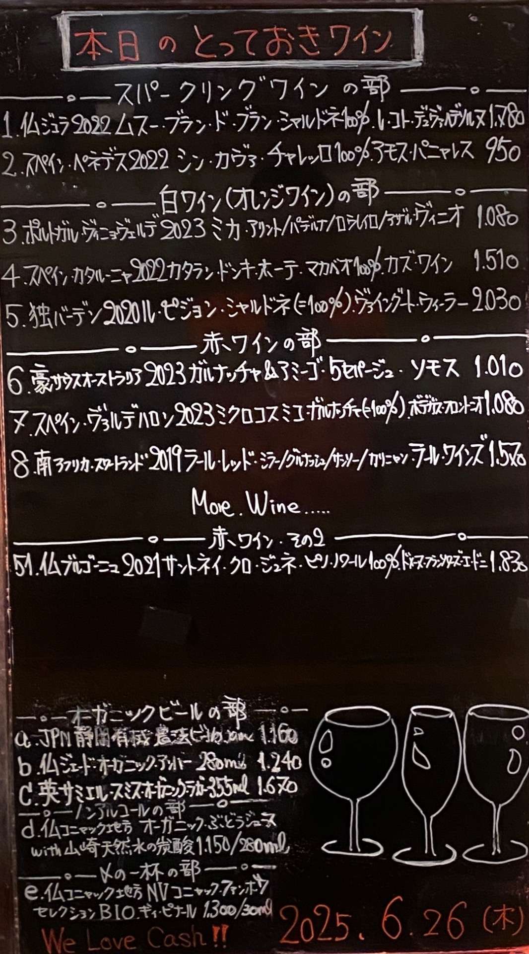 2025年6月26日 2025/06/26 皆さま、こんばんはーーッ! 今日もお席、空いております。 御予約、お待ちしておりまーす☆ ッーーーーーー事で今宵も千住葡萄酒 準備万端、整いましたョ〜 早速気合いイッパイ、元気イッパイ 張り切ってオープン致します♬ 皆さまのお越しを 心よりお待ちしております。 本日の変態セレクト、 とっておきワイン🍷ーーッ!!