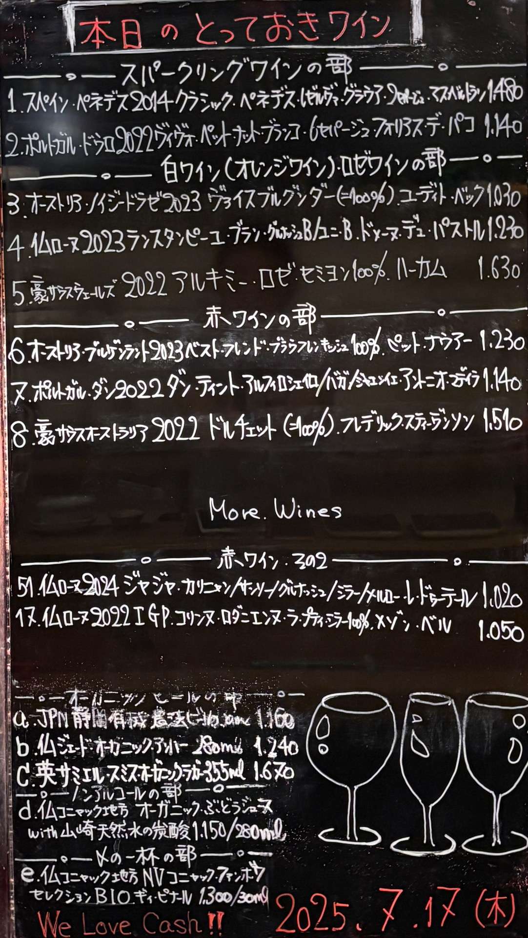 2025年7月17日 2025/07/17 皆さま、こんばんはーーッ! 今日もお席、空いております。 御予約、お待ちしておりまーす☆ ッーーーーーー事で今宵も千住葡萄酒 準備万端、整いましたョ〜 早速気合いイッパイ、元気イッパイ 張り切ってオープン致します♬ 皆さまのお越しを 心よりお待ちしております。 本日の変態セレクト、 とっておきワイン🍷ーーッ!!