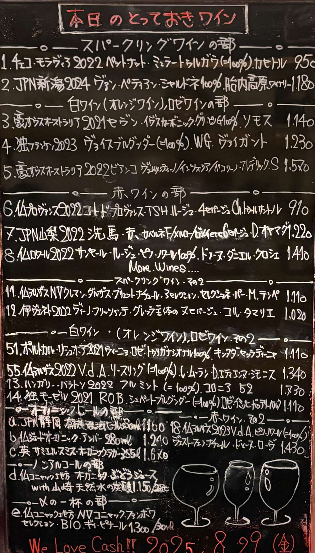 2025年8月29日 2025/08/29 皆さま、こんばんはーーッ! 今日もお席、空いております。 御予約、お待ちしておりまーす☆ ッーーーーーー事で今宵も千住葡萄酒 準備万端、整いましたョ〜 早速気合いイッパイ、元気イッパイ 張り切ってオープン致します♬ 皆さまのお越しを 心よりお待ちしております。 本日の変態セレクト、 とっておきワイン🍷ーーッ!!
