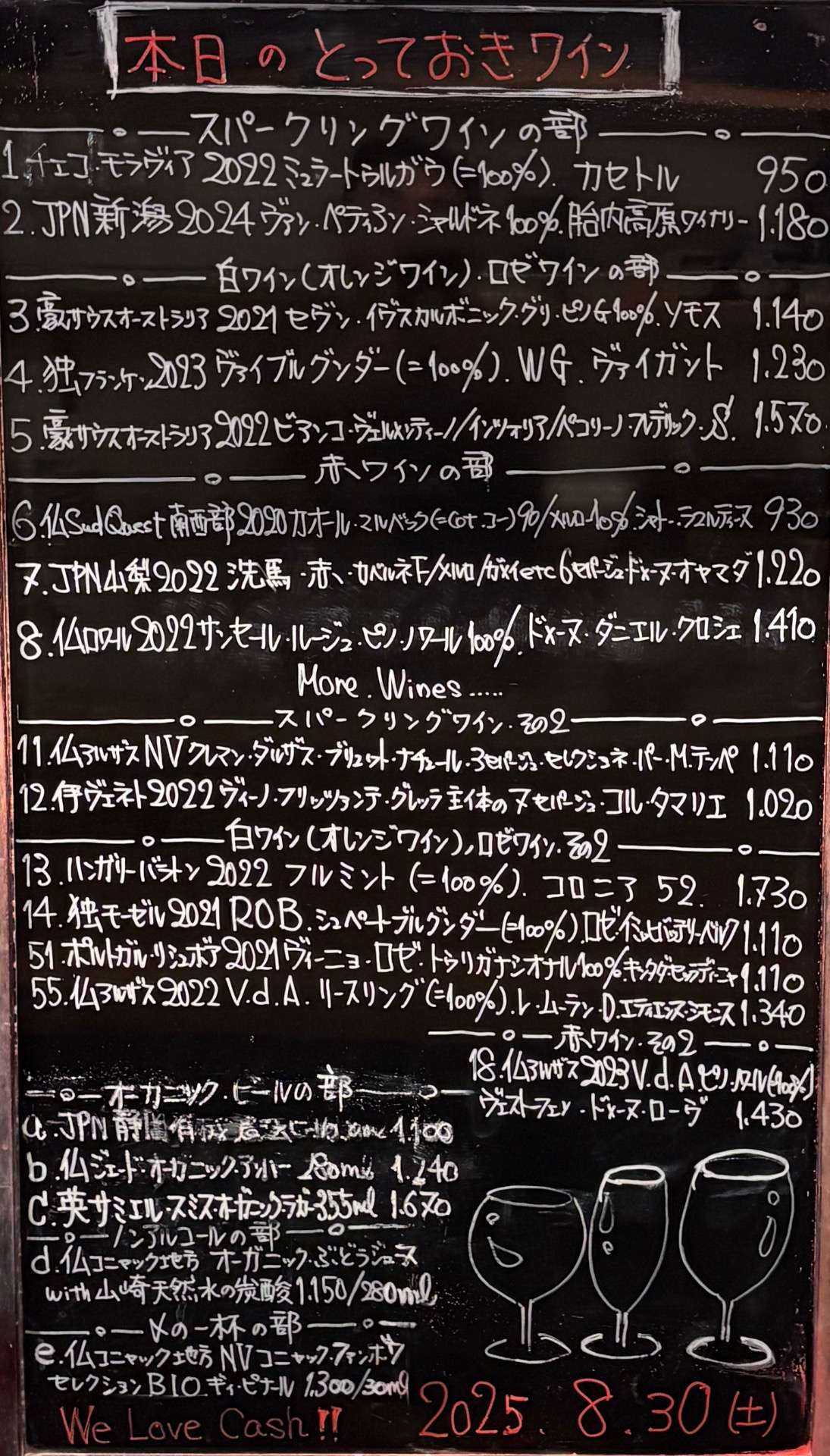 2025年8月30日 2025/08/30 皆さま、こんばんはーーッ! 今日もお席、空いております。 御予約、お待ちしておりまーす☆ ッーーーーーー事で今宵も千住葡萄酒 準備万端、整いましたョ〜 早速気合いイッパイ、元気イッパイ 張り切ってオープン致します♬ 皆さまのお越しを 心よりお待ちしております。 本日の変態セレクト、 とっておきワイン🍷ーーッ!!