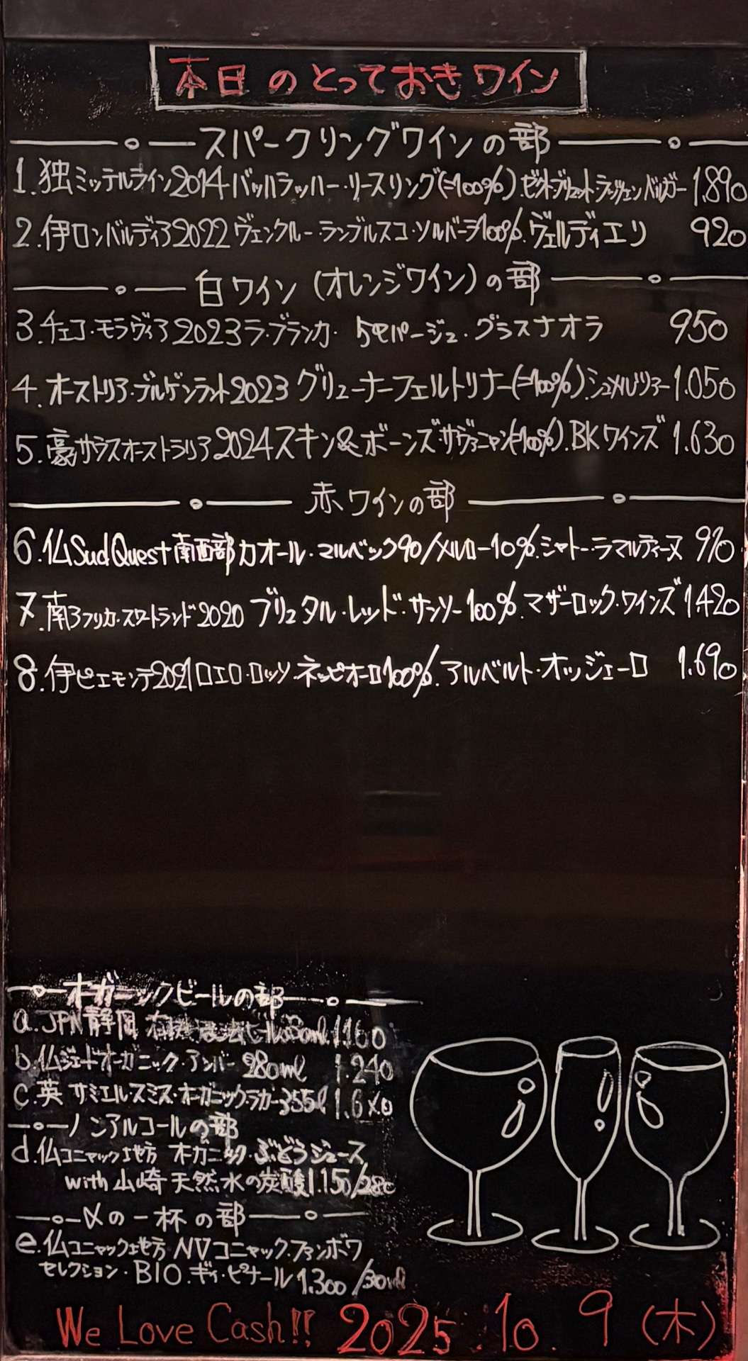 2025年10月9日 2025/10/09 皆さま、こんばんはーーッ! 今日もお席、空いております。 御予約、お待ちしておりまーす☆ ッーーーーーー事で今宵も千住葡萄酒 準備万端、整いましたョ〜 早速気合いイッパイ、元気イッパイ 張り切ってオープン致します♬ 皆さまのお越しを 心よりお待ちしております。 本日の変態セレクト、 とっておきワイン🍷ーーッ!!