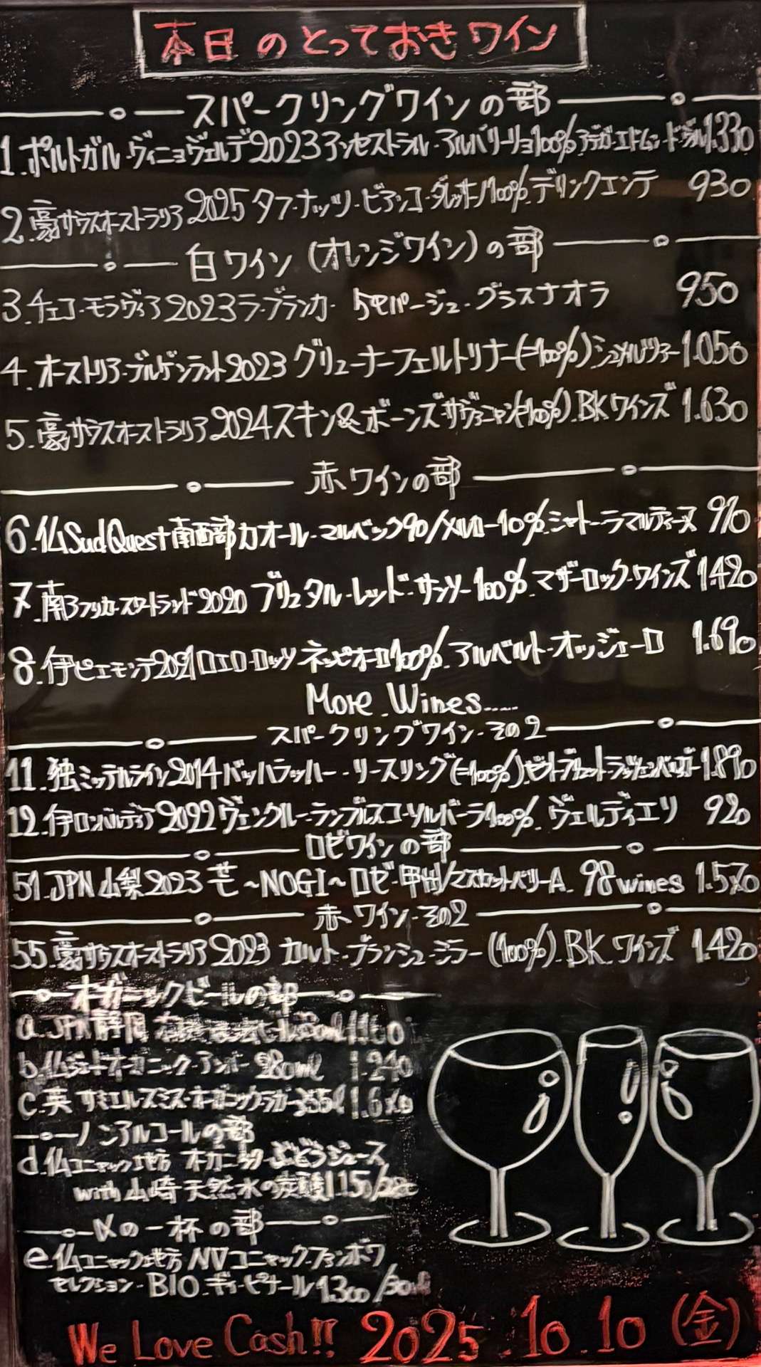 2025年10月10日 2025/10/10 皆さま、こんばんはーーッ! 今日も2席、空いております。 御予約、お待ちしておりまーす☆ ッーーーーーー事で今宵も千住葡萄酒 準備万端、整いましたョ〜 早速気合いイッパイ、元気イッパイ 張り切ってオープン致します♬ 皆さまのお越しを 心よりお待ちしております。 本日の変態セレクト、 とっておきワイン🍷ーーッ!!