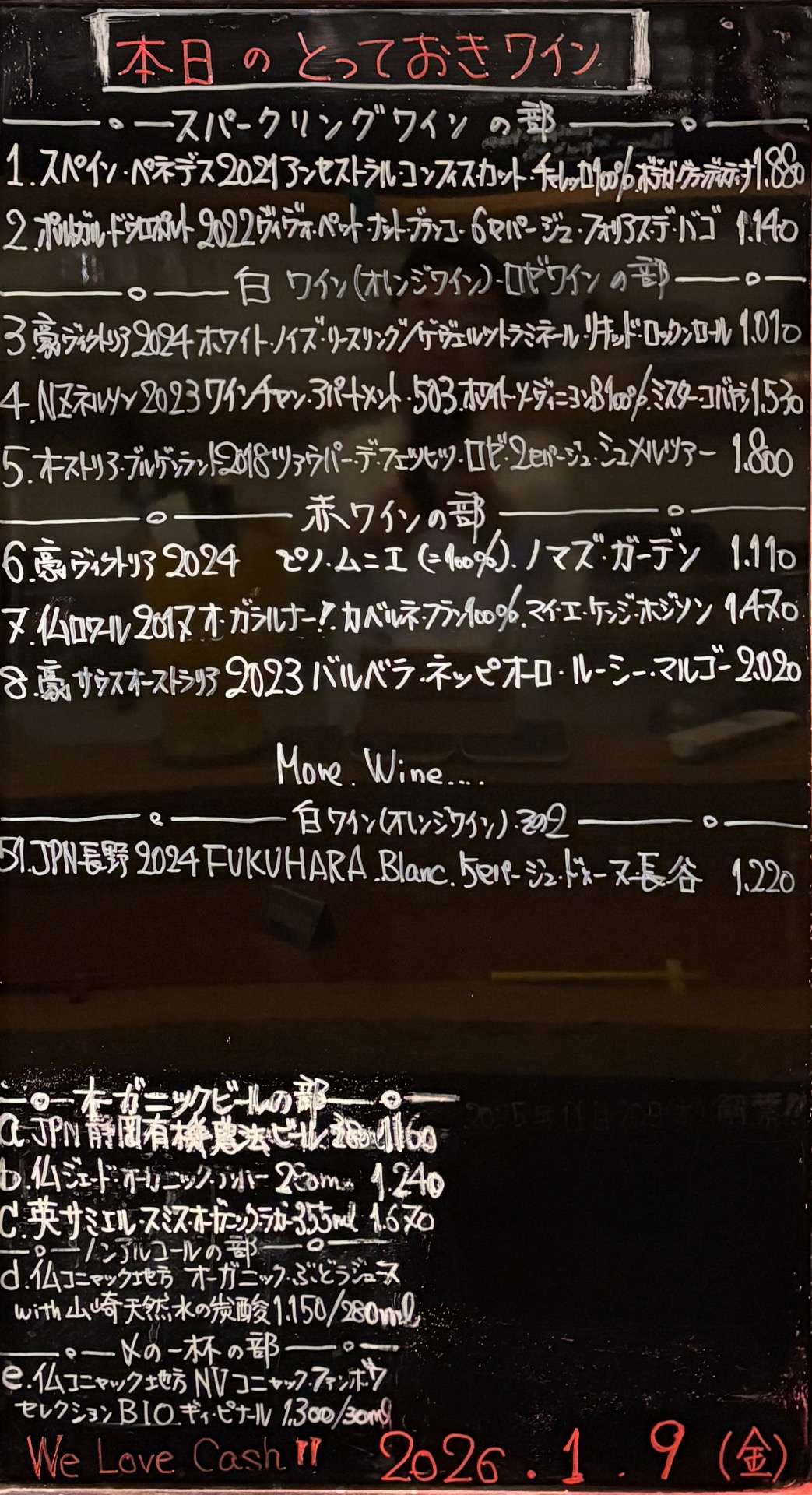 2026年1月9日 2026/01/09 皆さま、こんばんはーーッ! 今日もお席、空いております。 御予約、お待ちしておりまーす☆ ッーーーーーー事で今宵も千住葡萄酒 準備万端、整いましたョ〜 早速気合いイッパイ、元気イッパイ 張り切ってオープン致します♬ 皆さまのお越しを 心よりお待ちしております。 本日の変態セレクト、 とっておきワイン🍷ーーッ!!