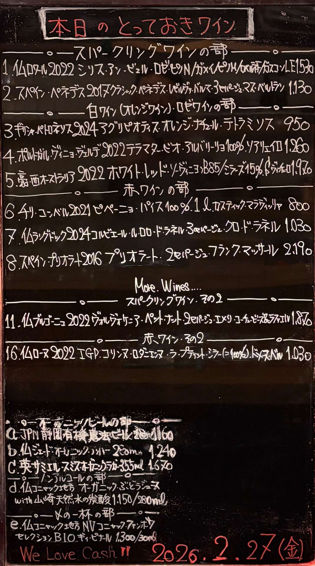 2026年2月27日 2026/02/27 皆さま、こんばんはーーッ! 今日もお席、空いております。 御予約、お待ちしておりまーす☆ ッーーーーーー事で今宵も千住葡萄酒 準備万端、整いましたョ〜 早速気合いイッパイ、元気イッパイ 張り切ってオープン致します♬ 皆さまのお越しを 心よりお待ちしております。 本日の変態セレクト、 とっておきワイン🍷ーーッ!!