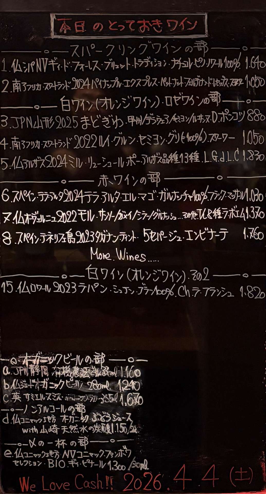 2024年4月4日 2026/04/04 皆さま、こんばんはーーッ! 今日もお席、空いております。 御予約、お待ちしておりまーす☆ ッーーーーーー事で今宵も千住葡萄酒 準備万端、整いましたョ〜 早速気合いイッパイ、元気イッパイ 張り切ってオープン致します♬ 皆さまのお越しを 心よりお待ちしております。 本日の変態セレクト、 とっておきワイン🍷ーーッ!!