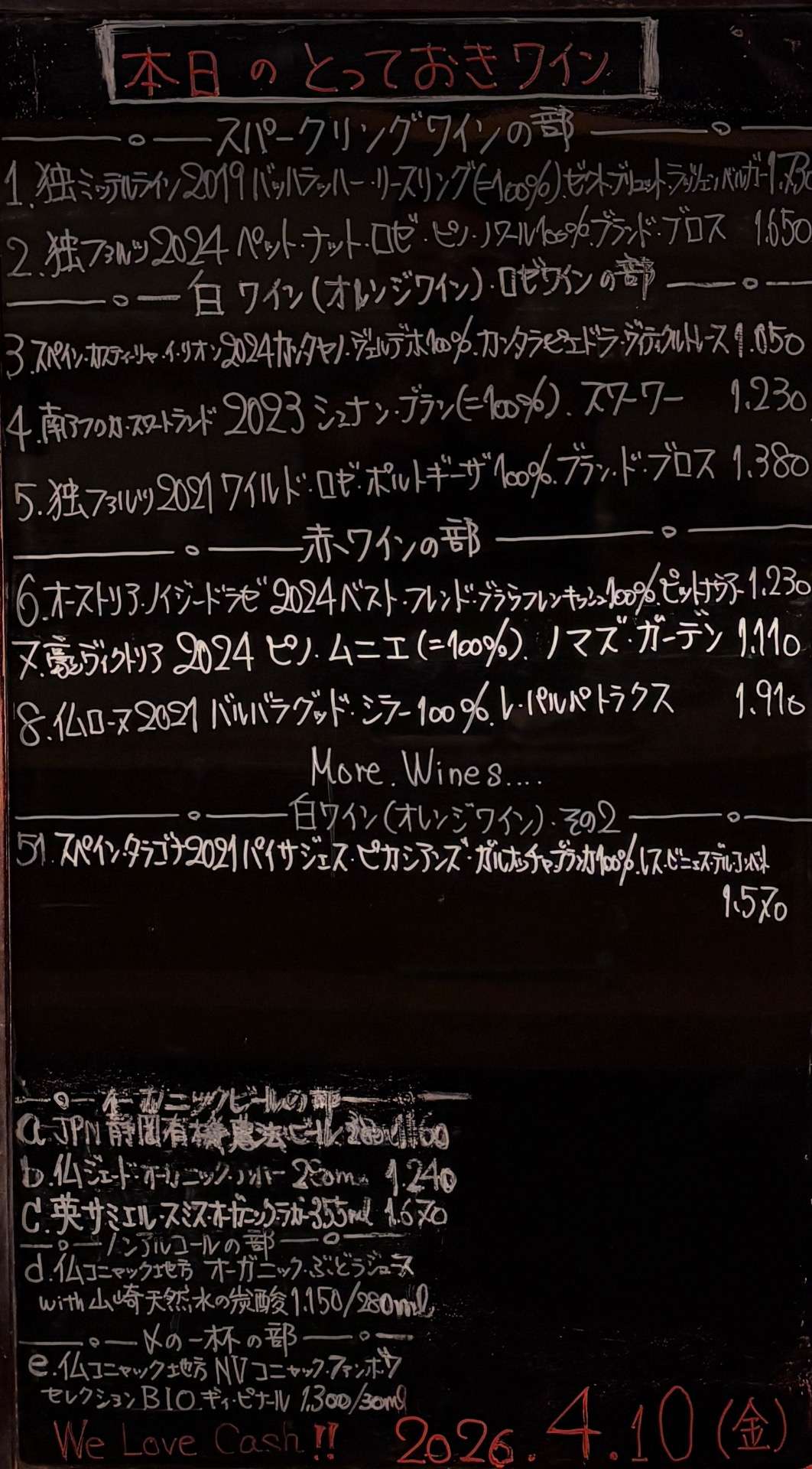 2026年4月10日 2026/04/10 皆さま、こんばんはーーッ! 今日もお席、空いております。 御予約、お待ちしておりまーす☆ ッーーーーーー事で今宵も千住葡萄酒 準備万端、整いましたョ〜 早速気合いイッパイ、元気イッパイ 張り切ってオープン致します♬ 皆さまのお越しを 心よりお待ちしております。 本日の変態セレクト、 とっておきワイン🍷ーーッ!!